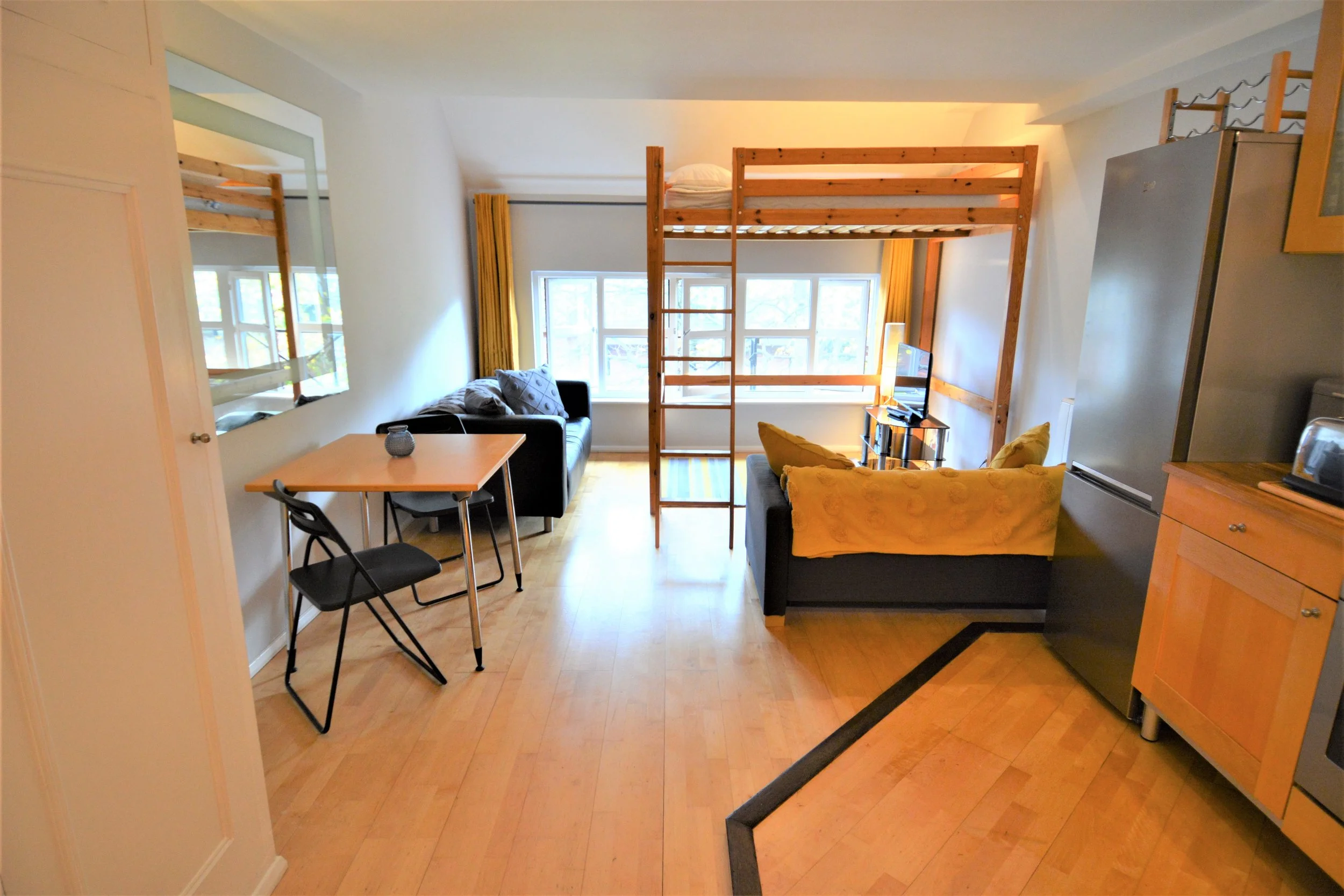 Finished to a high standard, this bright and welcoming studio features elegant wood flooring, a fully fitted modern kitchen with a washing machine, and a stylish, fully tiled shower room.